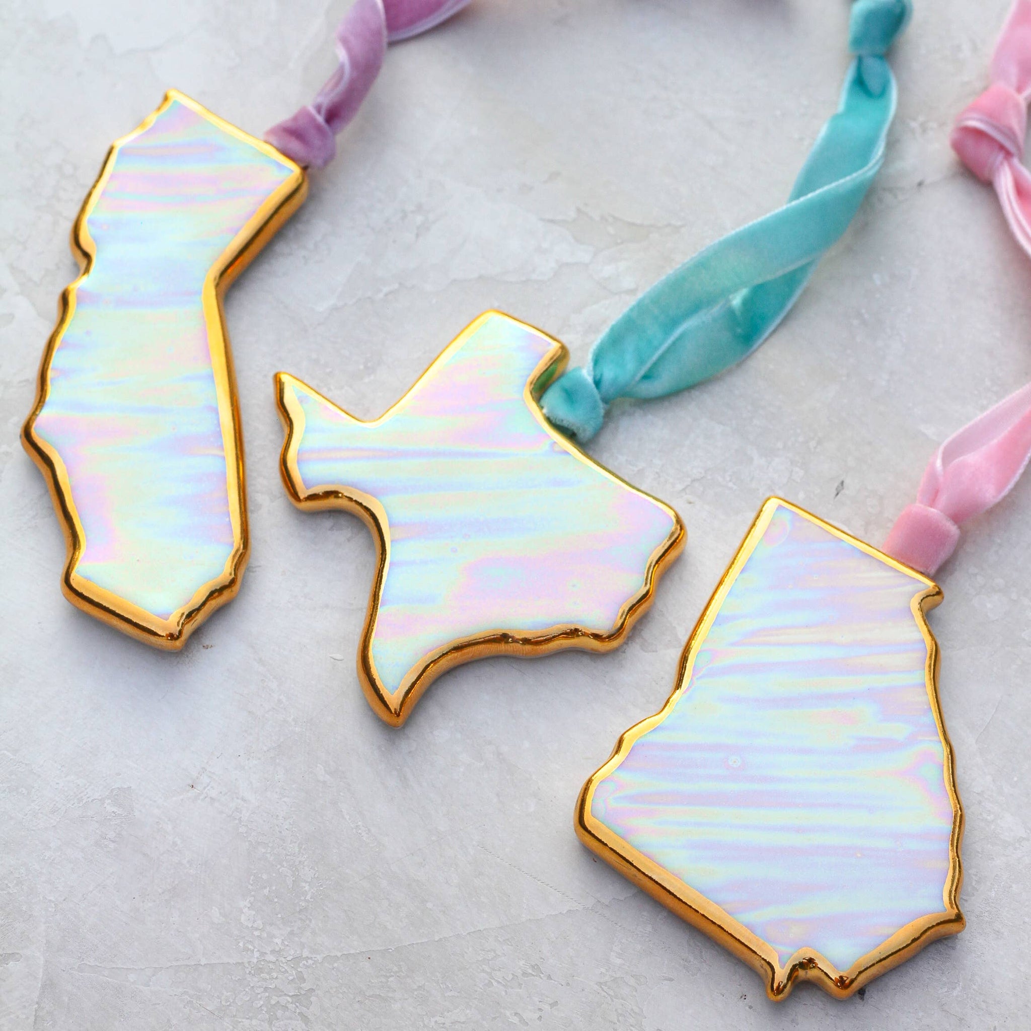 Celebrate your state pride with these beautiful porcelain ornaments, each handmade in the shape of a beloved U.S. state. Featuring an iridescent luster and outlined in luxurious 22k gold luster, these ornaments capture the elegance and charm of the season, making them perfect for holiday decorating or year-round display.