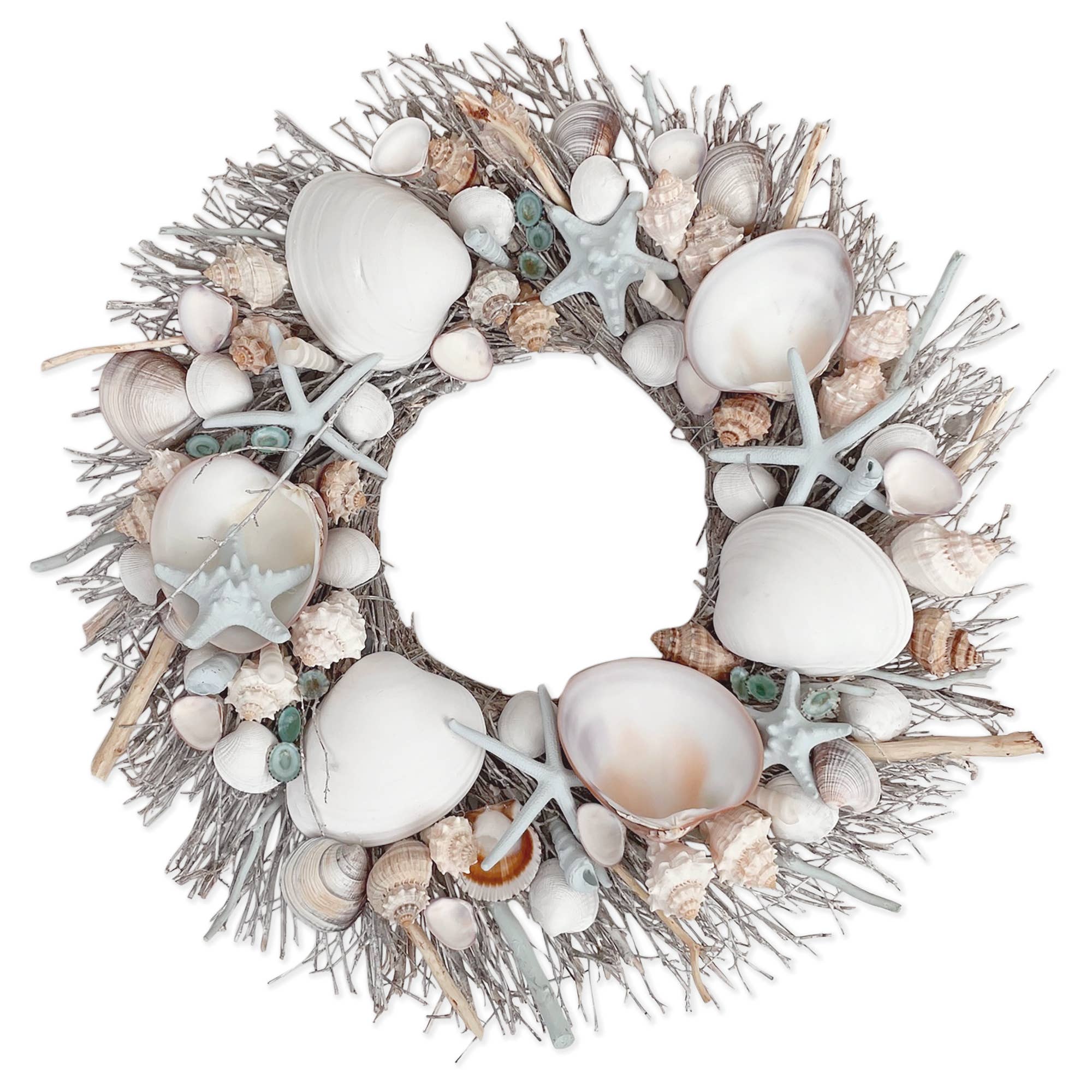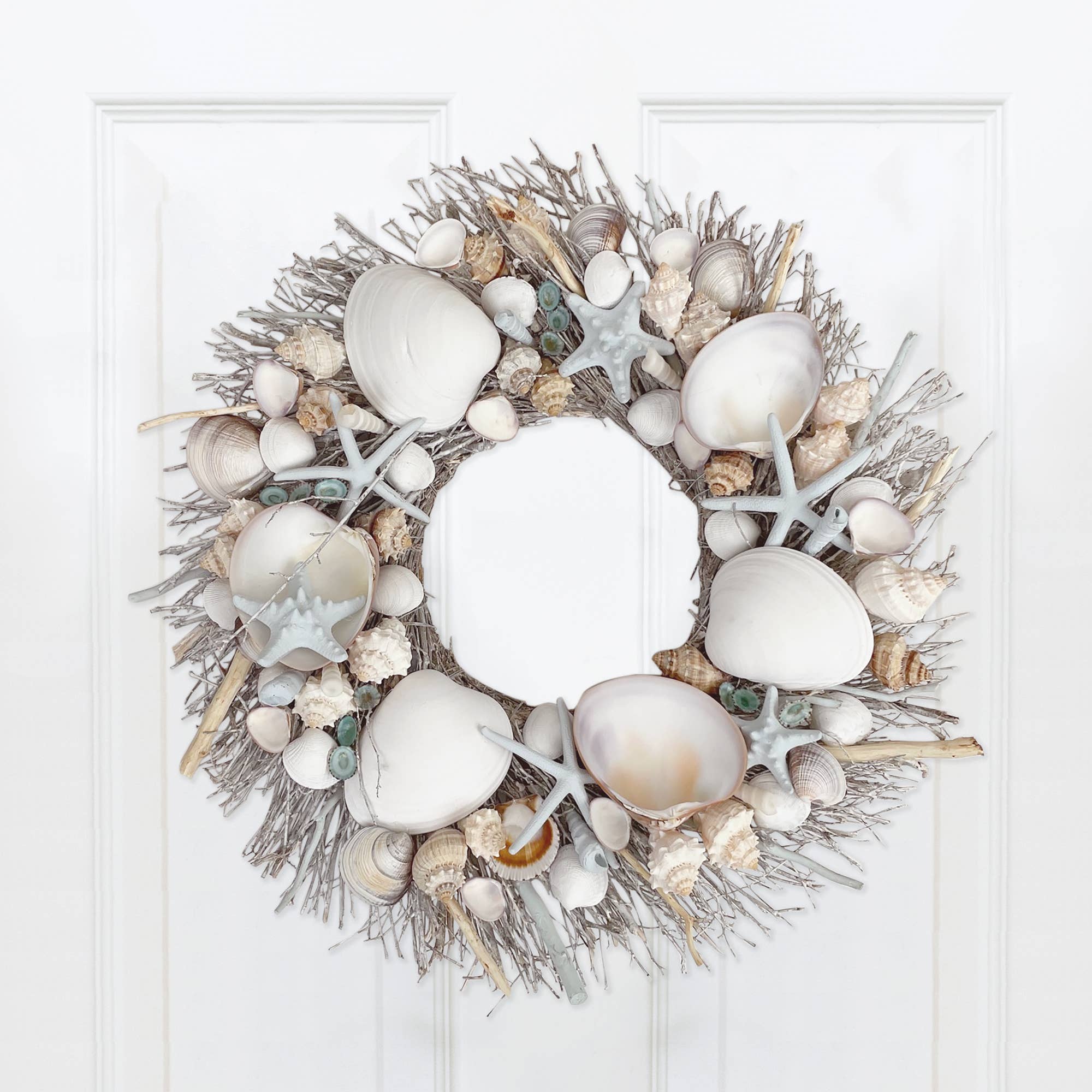 Made of natural and painted starfish, clamshells, and driftwood, this coastal wreath ships in a sturdy farmhouse style wood crate. Amazing Summer Beach House and Coastal Home Decor Wreath. Seashells last for years indoor or outdoor.