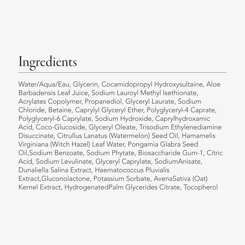 Water/Aqua/Eau, Glycerin, Cocamidopropyl Hydroxysultaine, Aloe Barbadensis Leaf Juice, Sodium Lauroyl Methyl Isethionate, Acrylates Copolymer, Propanediol, Glyceryl Laurate, Sodium Chloride, Betaine, Caprylyl Glyceryl Ether, Polyglyceryl-4 Caprate, Polyglyceryl-6 Caprylate, Sodium Hydroxide, Caprylhydroxamic Acid, Coco-Glucoside, Glyceryl Oleate, Trisodium Ethylenediamine Disuccinate, Citrullus Lanatus (Watermelon) Seed Oil, Hamamelis Virginiana (Witch Hazel) Leaf Water, Pongamia Glabra Seed Oil,Sodium Benzoate, Sodium Phytate, Biosaccharide Gum-1, Citric Acid, Sodium Levulinate, Glyceryl Caprylate, SodiumAnisate, Dunaliella Salina Extract, Haematococcus Pluvialis Extract,Gluconolactone, Potassium Sorbate, AvenaSativa (Oat) Kernel Extract, HydrogenatedPalm Glycerides Citrate, Tocopherol