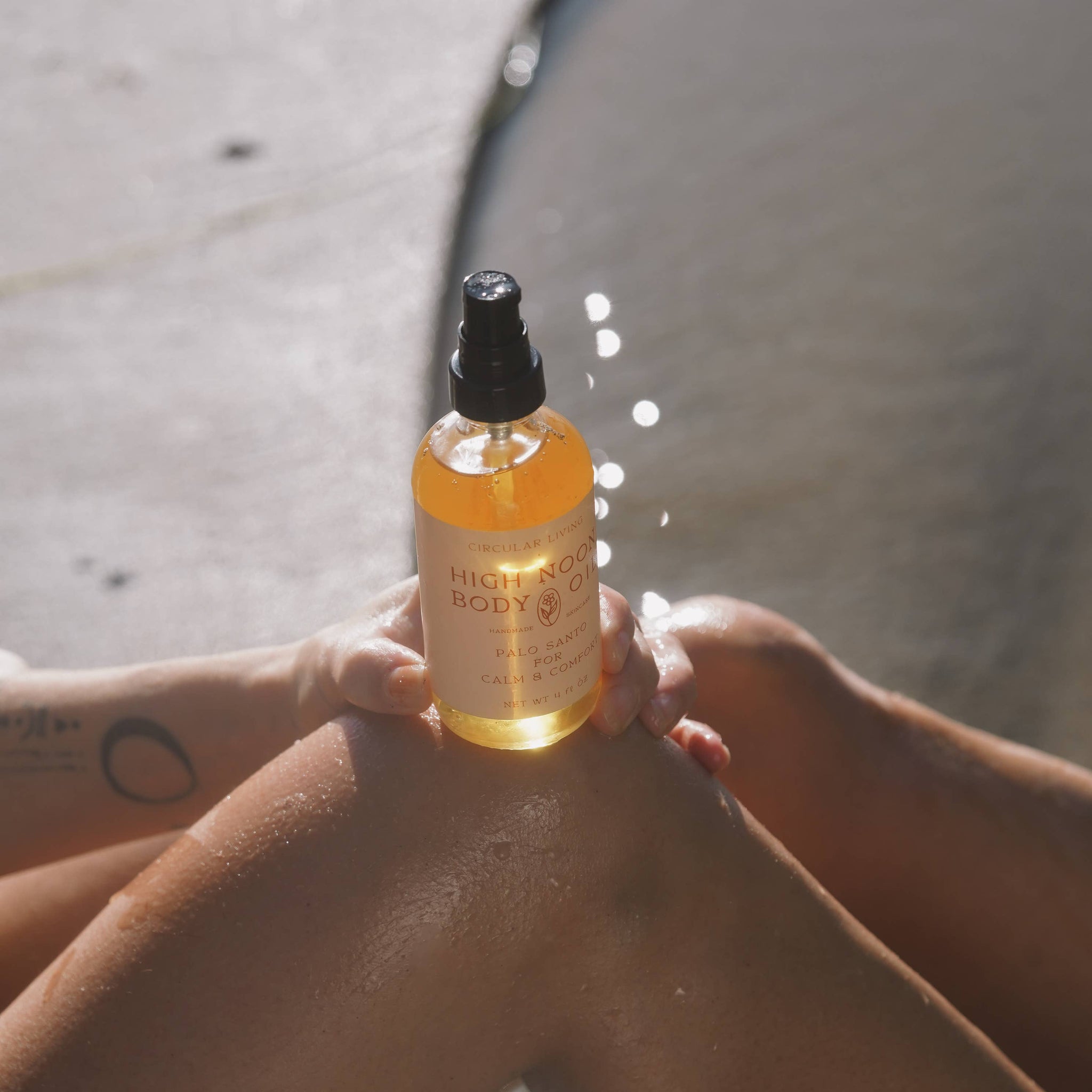 Our High Noon body oil combines nourishing and moisturizing plant oils with palo santo for calm and comfort.