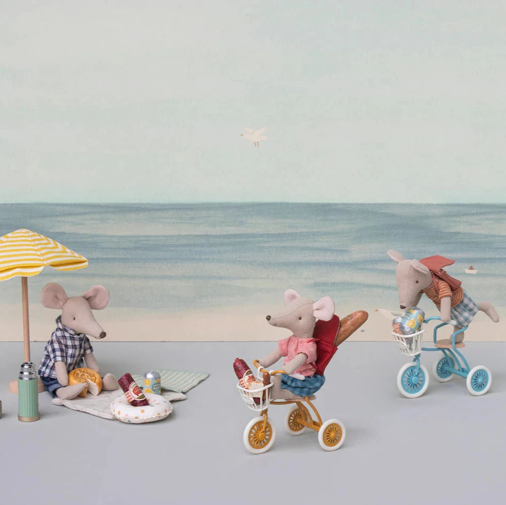 This metal basket fits Maileg tricycles. Place it on the handlebar and your mouse will always have storage space on the go, for any belongings.